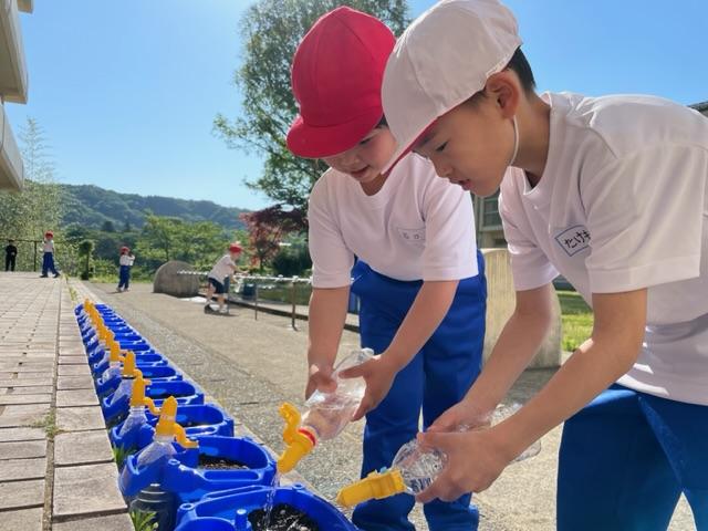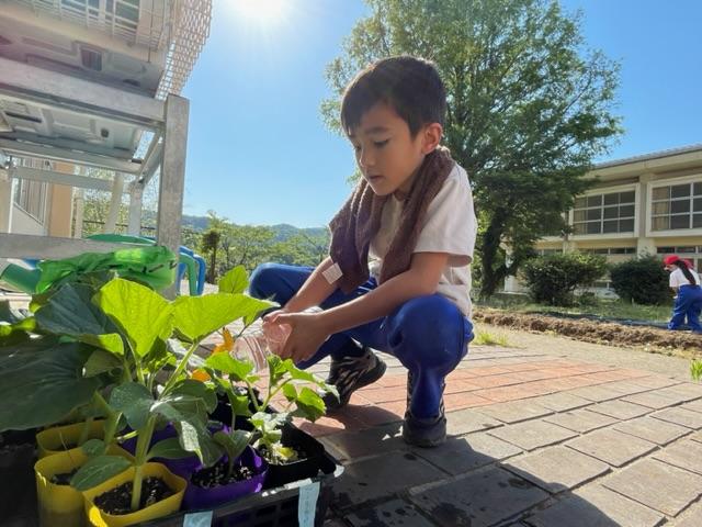 天気のいい日が続いています。朝から、アサガオや野菜の苗に水やりです。そんな仕事を楽しんでやってるのを見て、私も元気になりました- ̗̀ ( ˶'ᵕ'˶) ̖́-
