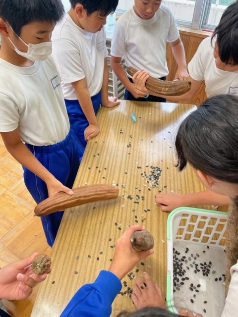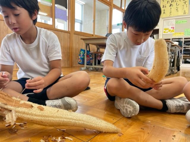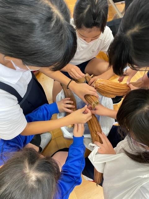 収穫したヘチマでタワシを作ろうと種を出したり、皮をむいたりしました。