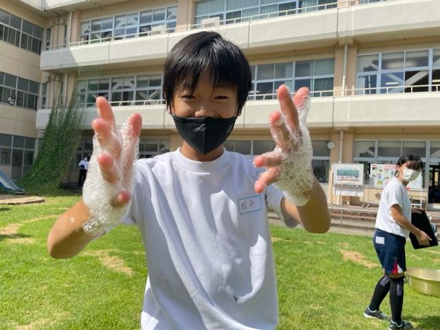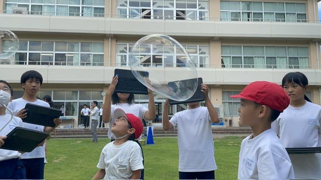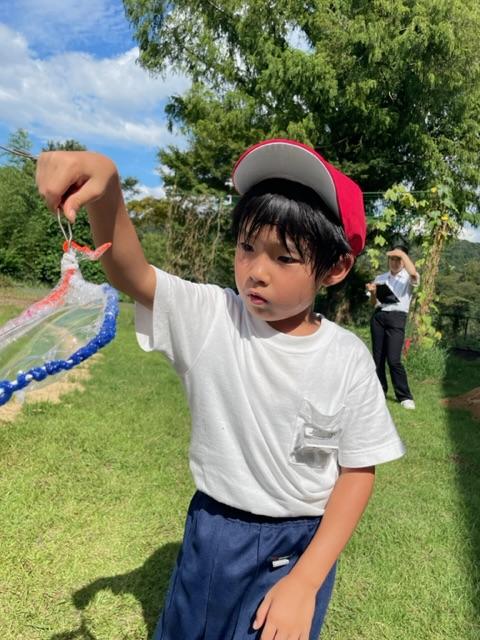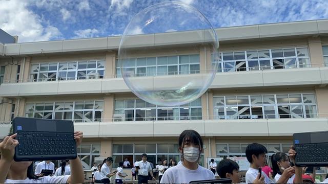 1年生はお気に入りのシャボン玉を作りました"٩(ー̀ꇴー́)6年生と一緒にやったので盛り上がってこんな大きなシャボン玉が浮かび上がりました。