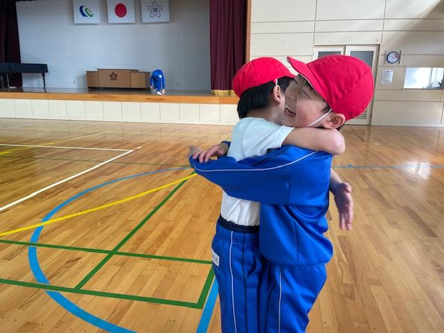 試合後には、抱き合って喜びます(๑˘ ³˘๑)