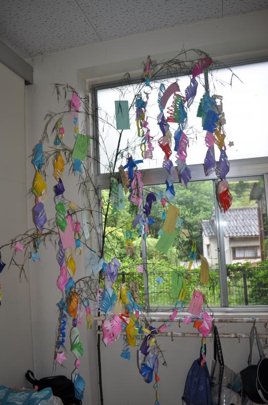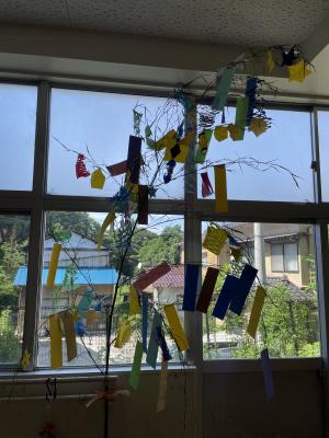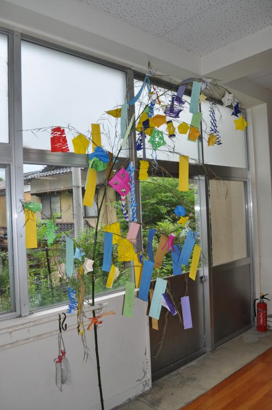 1,2、年生の教室前の廊下には願い事が書かれた短冊と飾りが~