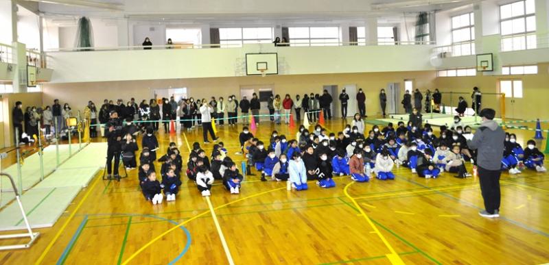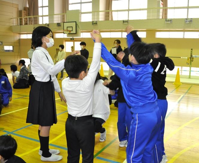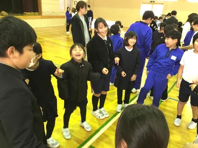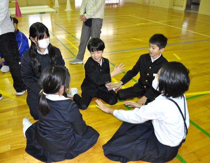 おあしす集会では、全校縦割りグループで「仲間集めゲーム」「キャ、キャ、キャッチ」