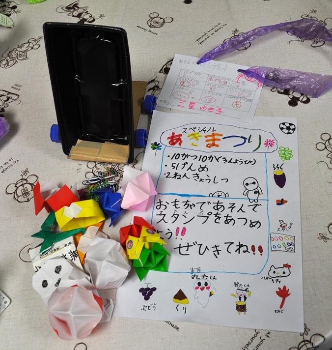 帰る前に、もう一度聞きたい!ということでアンコールをもらい、リコーダー演奏とよさこいを踊りました。プレゼントで皆さんが折り紙で作った「こま」をもらい、大喜びの子ども達!すてきな出逢い・ふれあいができました。しらさぎ苑の皆さんありがとうございました!