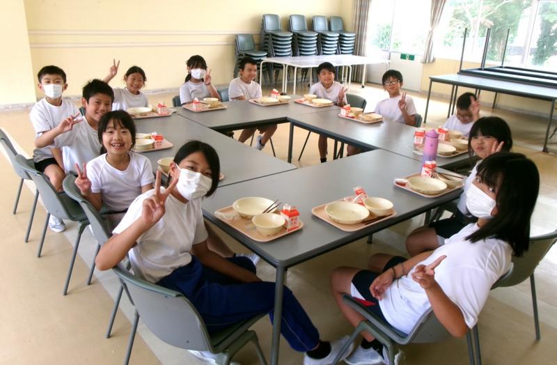 赤・黄・白・青のたてわり4チームで楽しくランチルームで給食を食べました。