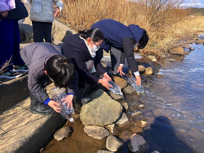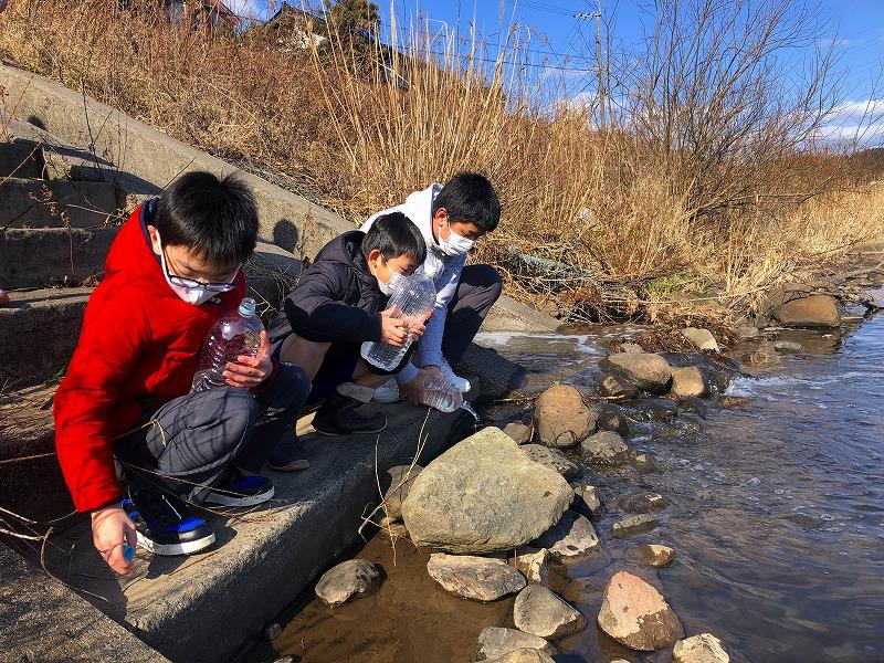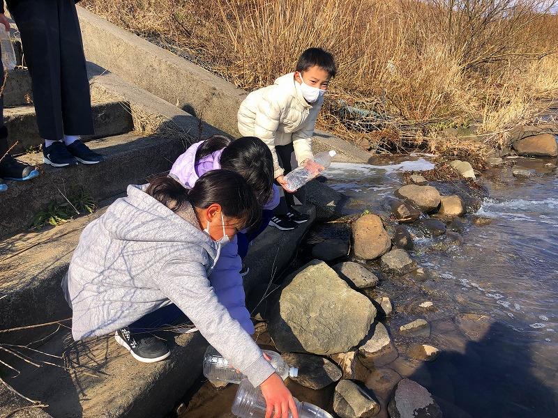 縦割り班で順番に河原田川に放しました。