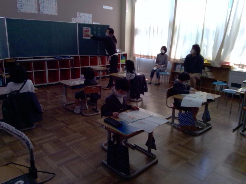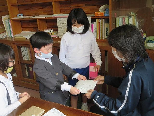 1年生が自分の名前を書いて、学校の子ども達、先生方に名刺渡しをしています。