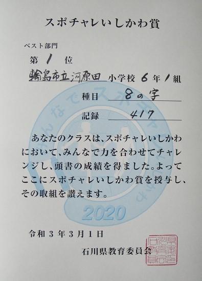 8の字跳びベスト部門で、6年生が3分間に417回跳んで県1位になりました。