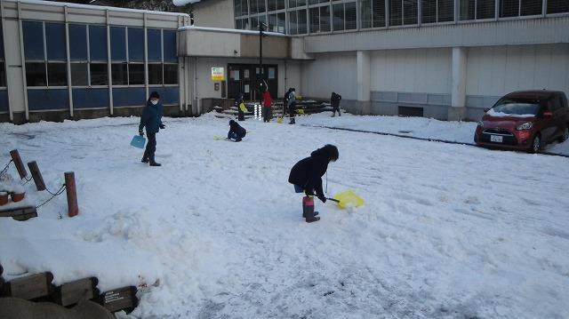 仕事始めの本日は校庭が雪で埋まっていました。職員の最初の仕事は雪かきでした。