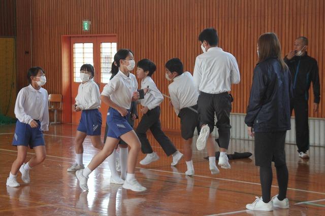 昨年はこわごわ跳んでいたはずの2年生も今年は1年生にアドバイスをしています。