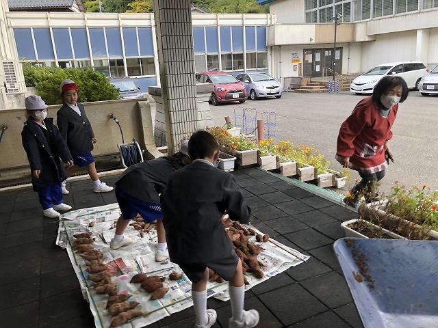 1年生が、春の分散登校時に植えたさつまいもを掘りました。