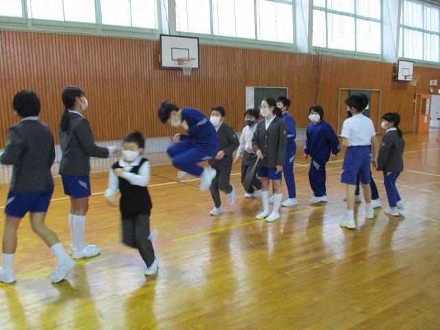 高学年が低学年の背中を押してあげ、みんなで跳んでいます。