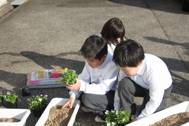 プランターを運んだり、土を入れたり、苗を植えたり…。