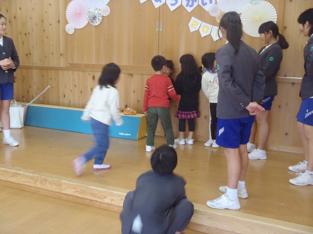 ペットボトルボーリング、だるまさんがころんだ、保小対抗玉入れ、魚釣りゲーム、をしました。