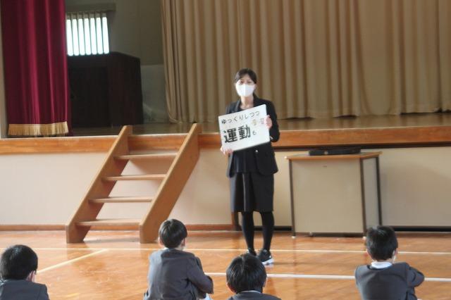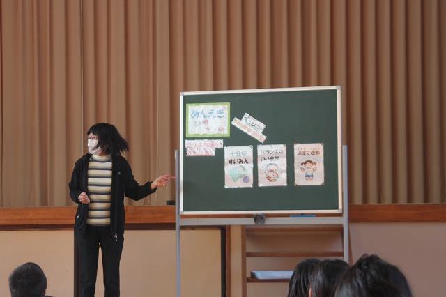 まず、今月の生活目標「寒さに負けない体をつくろう」について、保健の先生からお話がありました。