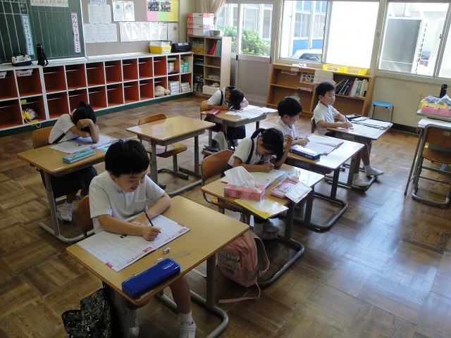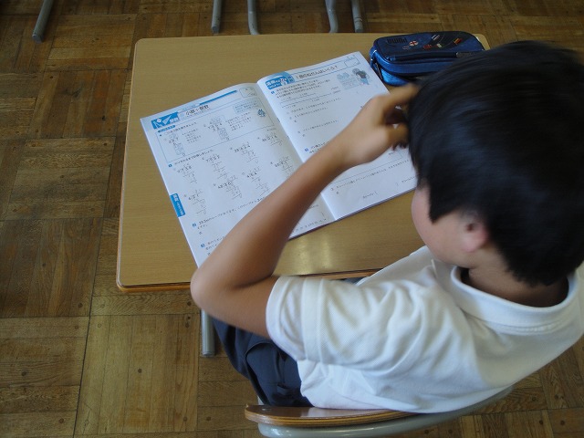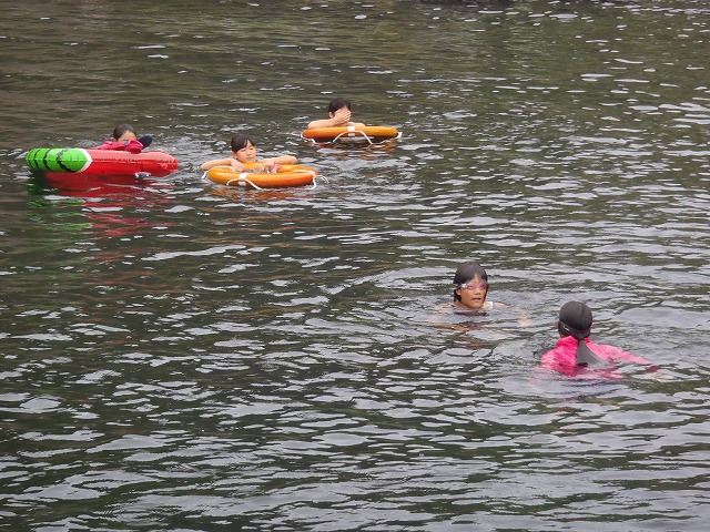 夏休み最初の1週間は、学校で「学習会・水泳教室」を行っています。冷房の効いた教室で、子どもたちは1学期の復習をしています。また、勉強の後は全校でプールに入り、水泳の練習をしています。