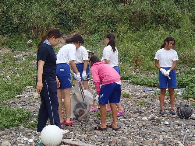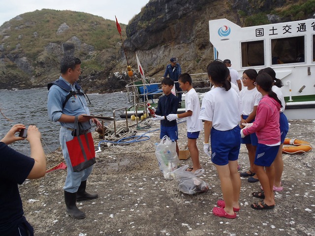国土交通省の方から説明を聞き、島内の漂着ゴミの収集と分類を行い、そして待ちに待った海水浴!!