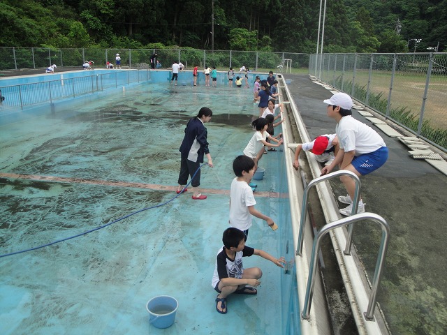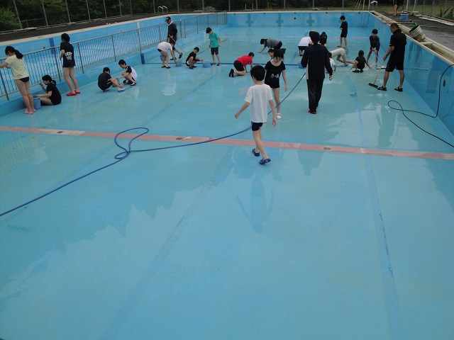 1~3年生はプールサイドの掃除、4~6年生はプールの中の掃除です。
