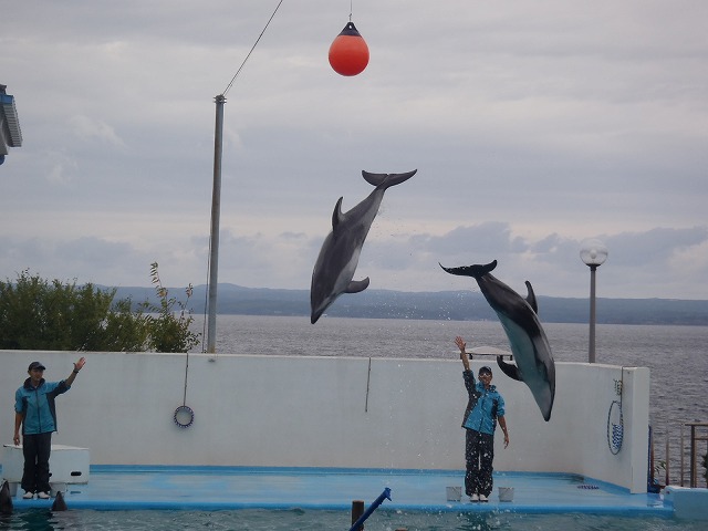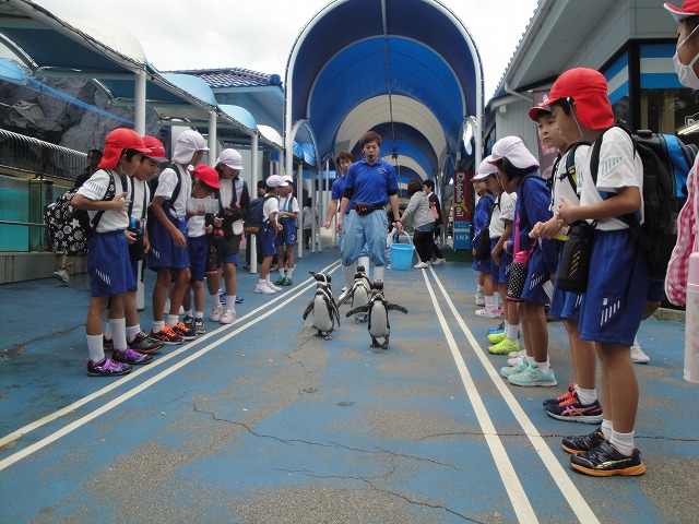 水族館では、ペンギンと歩いたり、イルカショーを楽しんだり…。ショーに参加した人も…。