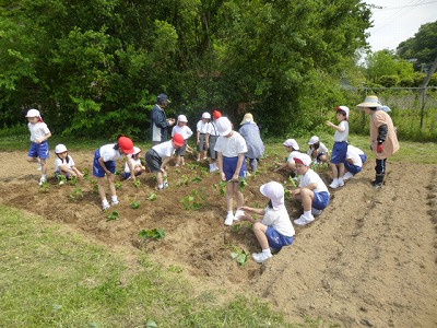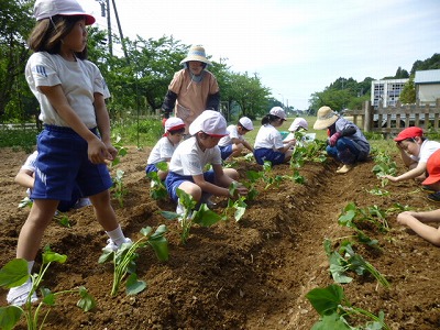 1・2・3年生は、地域の先生お二方にご来校をお願いし、さつまいもの苗の植え方を教えていただきました。
