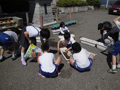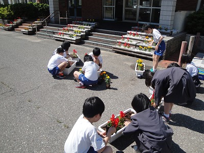 先日は6年生がプランターの花植えをしましたが、今日は4年生が花植え担当でした。
