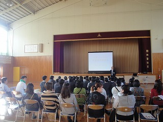 授業参観後、体育館で教頭先生による「親子のホッとネット大作戦」の講演がありました。