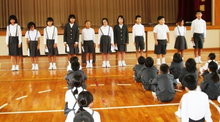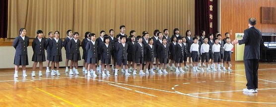 授業参観後、体育館で市の「合唱のつどい」で歌う歌を聞いてもらいました。