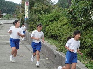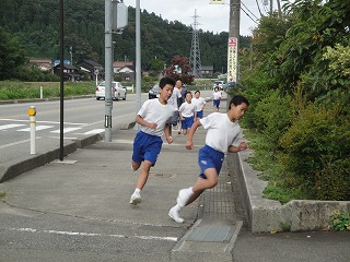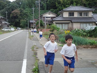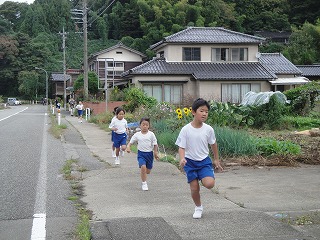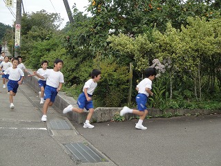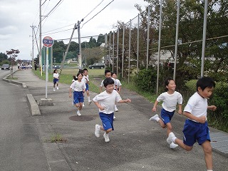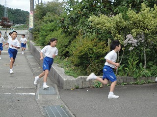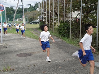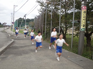 校舎周辺の道路を低学年は1周、中学年は2周、高学年は3周する、校内マラソン大会を2限目に行いました。