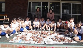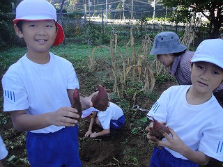 1・2年生がサツマイモほりをしました。畑の先生の表さんと山野さんに教えてもらいながら収穫しました。このイモは大学芋となって給食に出る予定です。