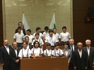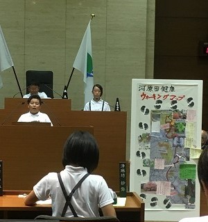 平上君が本校6年児童を代表して、市長さんに「市民が喜ぶウォーキングマップ」を提案しました。河原田地区の歴史や自然を満喫しながら、大人から子どもまで楽しく健康的に歩けるようなコースを紹介するとともに、道路や看板の整備を提案しました。