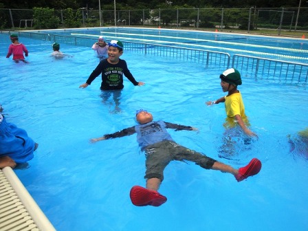 低学年プールで、本校5・6年生と園児がペアになって遊びました。元気よくはしゃぎ回る園児もいれば、初めはおそるおそる抱っこされながらやっと水につかった園児もいました。終わりの方は全員が水に慣れ、楽しく遊ぶことができました。