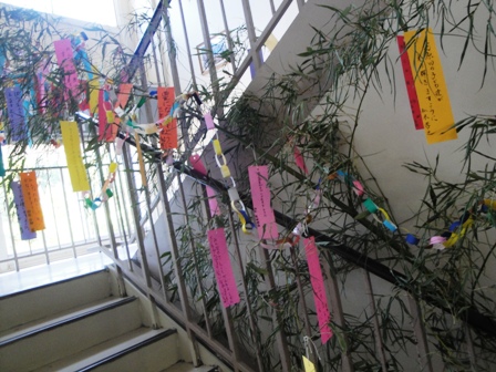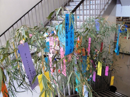 全校児童と先生方が願い事を書いて笹に結びました。今日は晴れ。夜は、天の川や牽牛(わし座のアルタイル)、織女(こと座のヴェガ)が見えるといいですね。