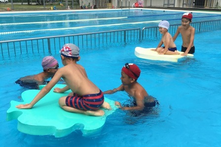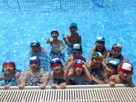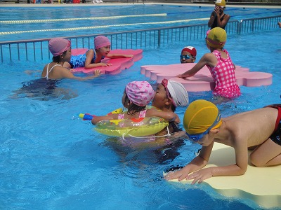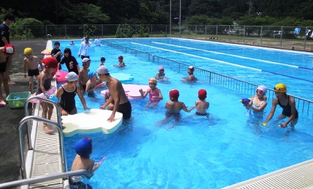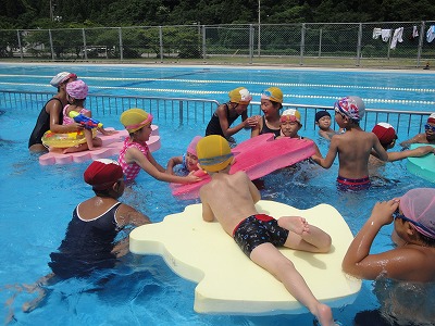 7月27日(木)と8月3日(木)に河原田保育所の園児を招いて、プール交流会を行いました。