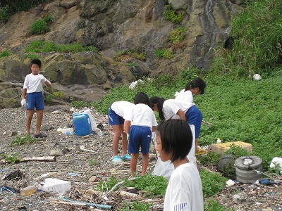 七ツ島海域は能登半島国定公園の特別保護地区に指定され、豊かな自然が守られていることを学習しました。七ツ島(大島)に着くと、まず漂着物を集めたり、自然観察をしたりしました。次に海の中の自然観察もしました。