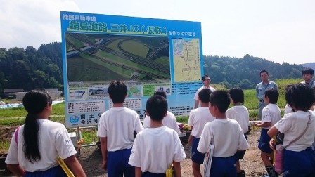 はじめに、三井IC(仮称)の工事現場の完成パース看板前で輪島道路の概要についての説明を聞きました。道路ができるまでのことや自動車専用道路であることなどを学習しました。
