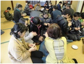 横地町区長さんをはじめとするたくさんの方々が、杵と臼でついているところや、蒸しているところ、犬の形をつくっているところを見せてくださいました。「犬の子まき」の言われなどの質問にも答えて下さいました。そして、みんなも、「犬の子」を作らせていただくことができました。丁寧に教えていただいて、みんな上手にできました。「うまいもんや」と言われ、大満足でした。