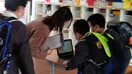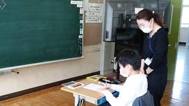 この日から,朝の健康チェックをICT化しました。児童が玄関の非接触式検知器で体温を測り,クロームブックに体調とともに打ち込みます。その結果は職員のクロームブックでデータ化されたものを見て確認することができます。