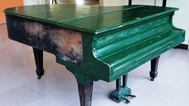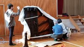 1階ワークスペースのグランドピアノ(緑色。戦前に作られたもの。ピアノ線が何本も切れていた。)と,体育館のアップライトピアノ(正確な調律ができなくなっていた。)がこの学校を去り,代わりに比較的新しいグランドピアノが本校へやって来ました。グランドピアノは体育館に設置されました。これからいい音色で校歌等が歌えますよ。