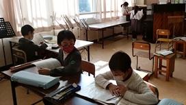 この日は,年に3度の指導主事訪問でした。1・2年は国語,3・4年は音楽,5・6年は学活,のびのびは総合的な学習の時間を行いました。1・2年は,欠席児童がいたため,1年も2年も1人ずつ。どちらの児童も,相手の方に先生が行った際に,すこし相手のことが気になる様子も見えました。3・4年は,3人ずつ学年ごとに分かれ,別々の曲を合唱・合奏していました。互いの音がかなり大きく聞こえる中,しっかり集中できていました。5・6年生,のびのびも,さすが高学年。しっかりがんばっていました。