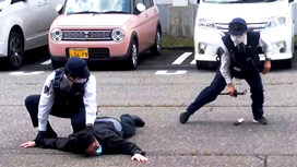 避難訓練の後,引き続いて防犯教室を行いました。本日の訓練で不審者役をお願いした輪島警察署の延命さんから,不審者に会ったときの逃げ方を学びました。児童たち,ランドセルを外して逃げる方法(左写真)や捕まれた手を振りほどく方法(中央写真)を学び,早速不審者から逃げる練習で生かしていました。延命さん,朝市交番の皆様,ありがとうございました。