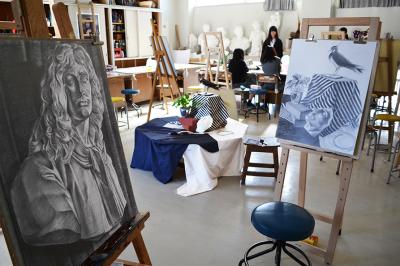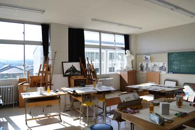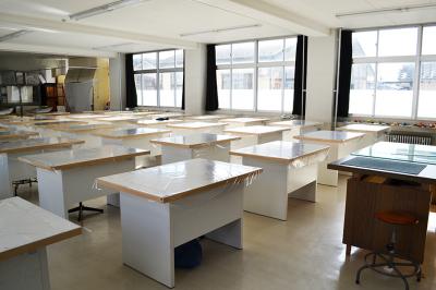 平面・立体デザイン実習室40人が同時に実習ができ、様々な制作を行っている部屋です。 | |