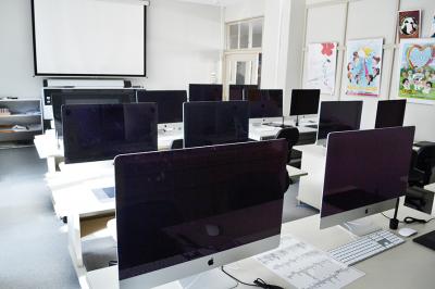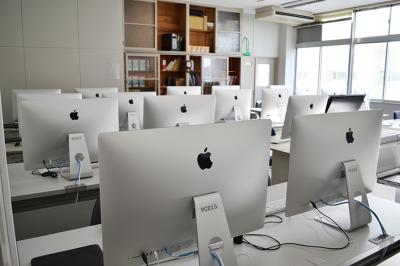画像処理室コンピュータ室です。Macintoshマシンが22台入っています。平成25年に整備され、CGや画像編集、動画、3D制作などを行うことが出来ます。 | |