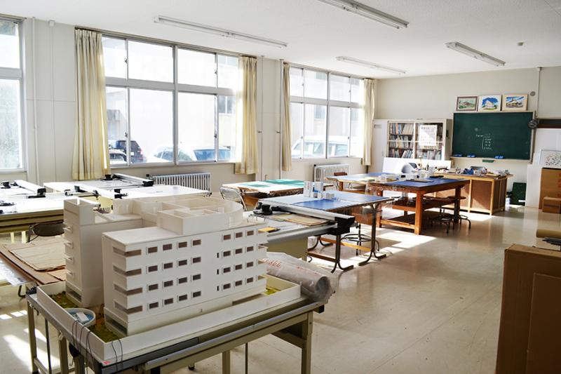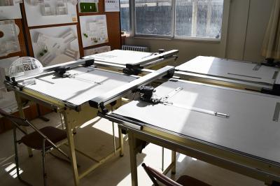 インテリア実習室建物の内部空間デザインができる環境が用意されており、製図や建築モデルを制作することができます。 | |