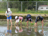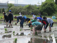 Fさん他3名の地域の方に教わりながら、田植えをしました。はじめは裸足で田んぼに入ることに抵抗を感じていた子もいましたが、だんだん慣れて笑顔もたくさん見られました。