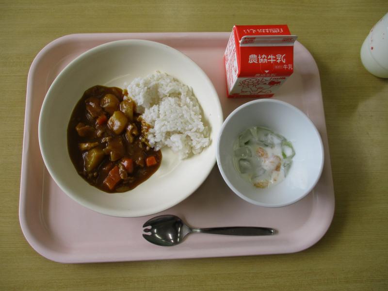 メニューは ポークカレーライス、ヨーグルト和え、牛乳でした。