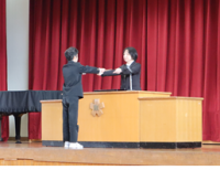 児童会各委員会の委員長・副委員長・書記、そして学級委員の名前が呼ばれ、代表の企画委員長が任命書を受け取りました。