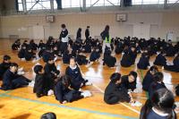 5年生は書写。毛筆で「道」を書く練習していました。右払いに苦戦しながらも頑張っていました。