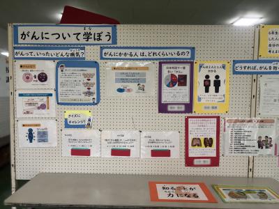 先月6年生で行った「がん教育」。その後の活動として、1階中央ホールに「がん」についての掲示や、授業で使用したワークシート(一部)、児童が作成したポスターを掲示しています。