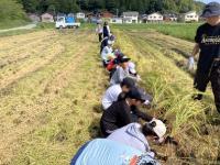 5年生が稲刈りをしました。5月9日に田植えをしたときには20センチほどだった苗が 4か月で大きく立派に育ったことにあらためてびっくり! 使い慣れない鎌を手に、地域の名人さん達にご指導いただきながらのチャレンジです。台風10号の影響による大雨のあとで足元がぬかるんでいて 長靴が沈んで動けなくなった子も何人かいましたが、それも楽しんでいた(?)ようです。