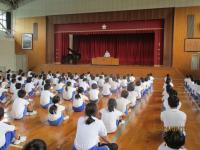 1・2年生が「防犯教室」に参加しました。大聖寺警察署生活安全課の方から もしも登下校時や放課後に不審者に遭遇してしまったらどうすればよいかを教えていただきました。