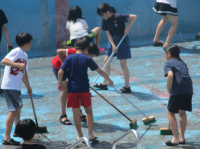 プールの緑色に濁った水を抜くと 底や壁には汚れがびっしり! それをみんなで根気強くブラシで丁寧にこすって流し洗いました。プールサイドやトイレなどもきれいにしてくれました。